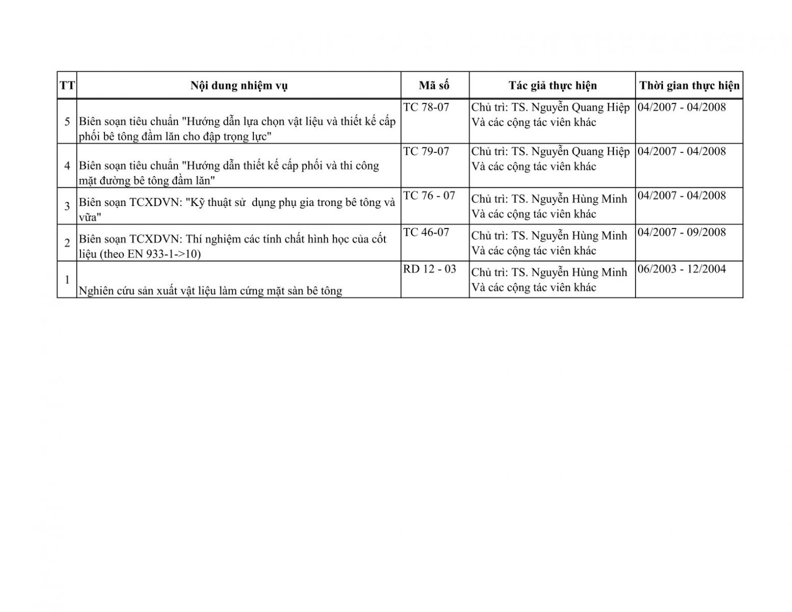 Danh mục các đề tài đã thực hiện